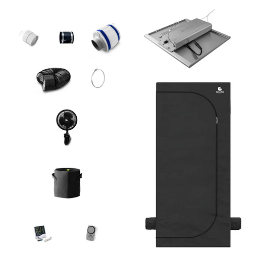 Das Caluma Bundle beinhaltet eine Growbox, eine hochwertige Caluma LED Force 150WLampe, ein passend auf das Set abgestimmtes Lüfterset, ein Clip Fan, ein Thermo-Hygrometer, eine Zeitschaltuhr und einem Caluma PotPot 11l Stofftopf.